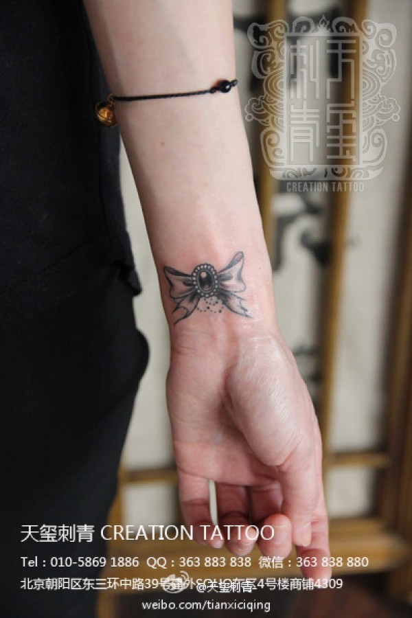 女生手腕唯美小巧的黑灰蝴蝶结纹身图案_蝴蝶纹身图案大全_纹身图吧
