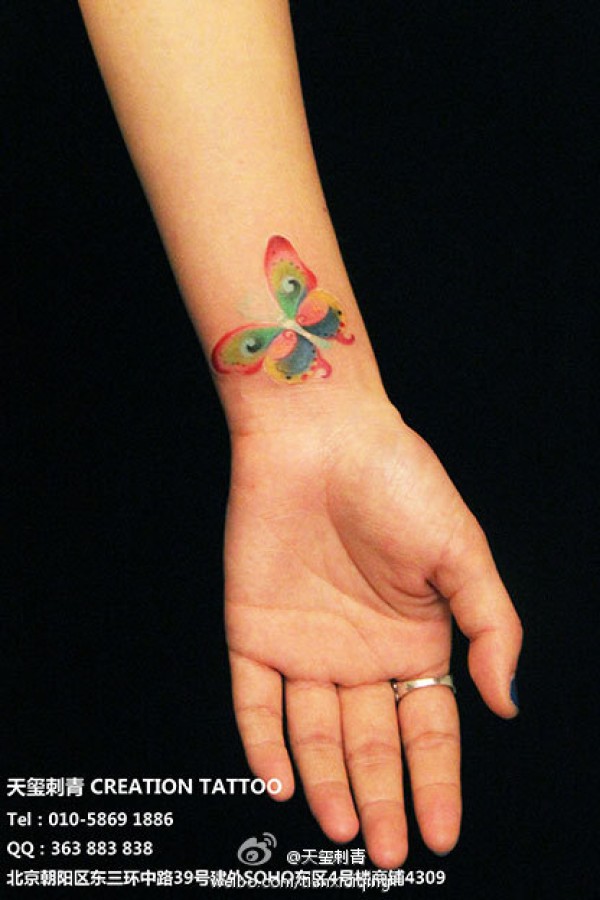 女生手腕小巧精美的彩色蝴蝶纹身图案_蝴蝶纹身图案大全_纹身图吧