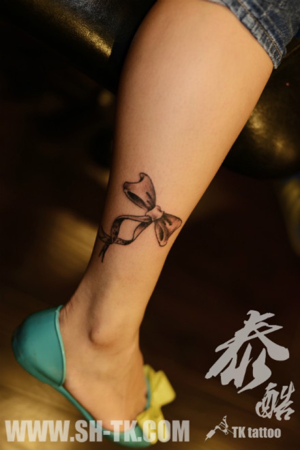 女生腿部唯美小巧的黑灰蝴蝶结纹身图案_蝴蝶纹身图案大全_纹身图吧