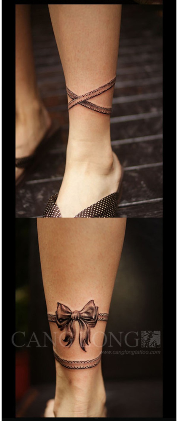 女生腿部时尚精美的蝴蝶结与蕾丝纹身图案_蝴蝶纹身图案大全_纹身图吧