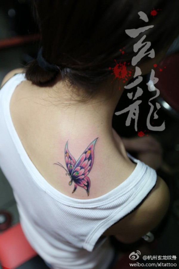 女生肩膀处小巧好看的彩色蝴蝶纹身图案_蝴蝶纹身图案大全_纹身图吧