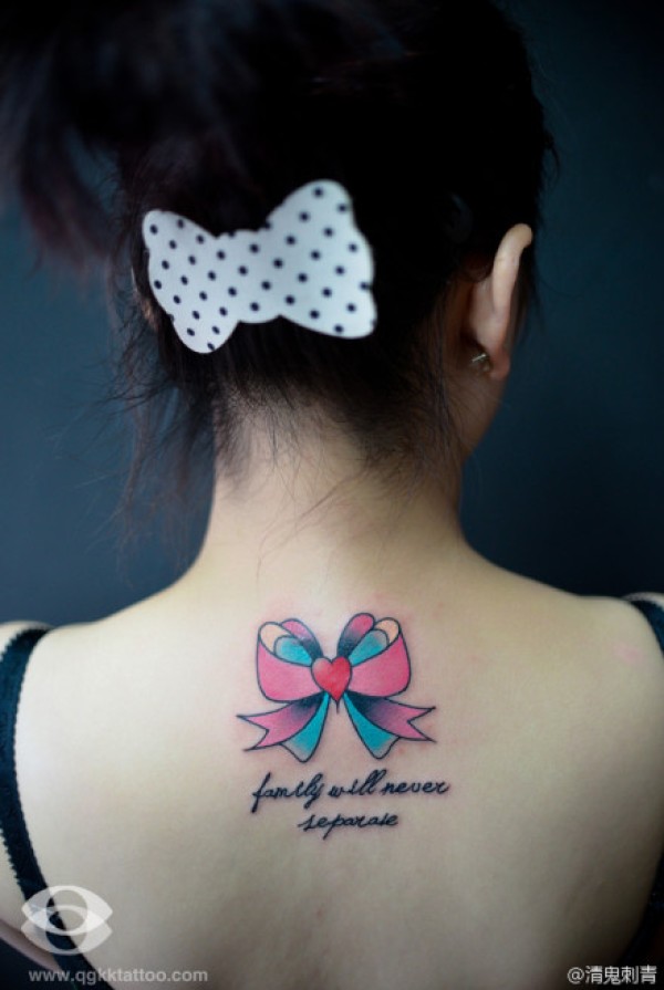 女生后颈部经典潮流的蝴蝶结纹身图案_蝴蝶纹身图案大全_纹身图吧