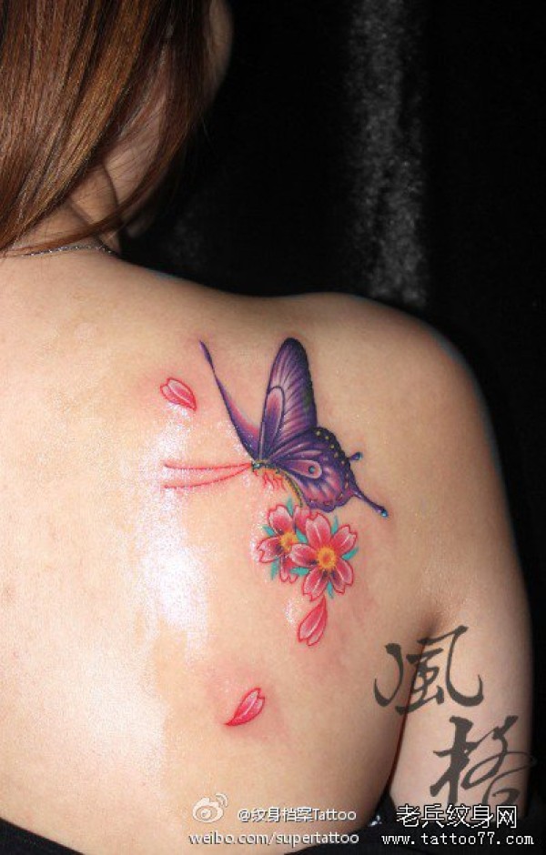 女孩子肩背漂亮唯美的彩色蝴蝶纹身图案_蝴蝶纹身图案大全_纹身图吧