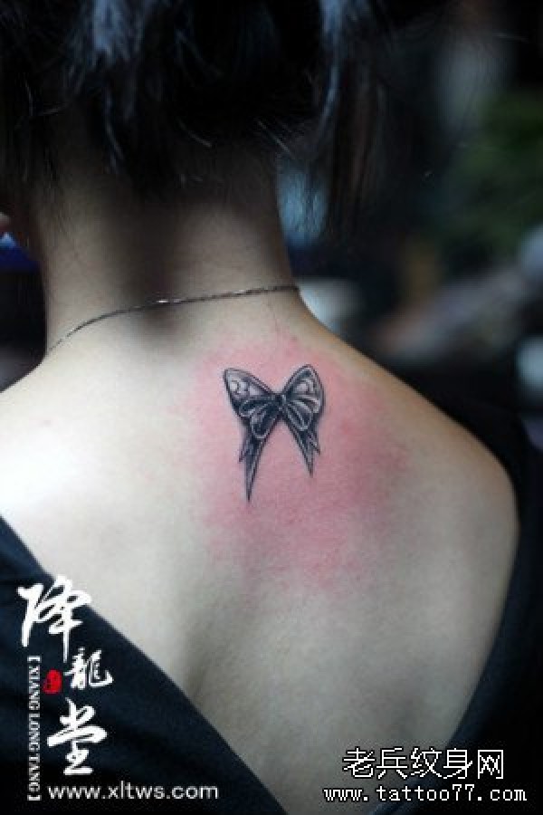 女生后背小巧潮流的黑灰蝴蝶结纹身图案_蝴蝶纹身图案大全_纹身图吧
