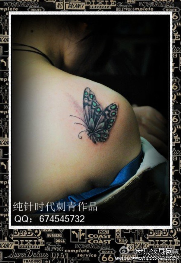 女生肩膀处潮流的黑灰蝴蝶纹身图案_蝴蝶纹身图案大全_纹身图吧