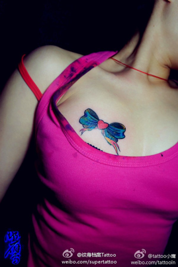 女生胸部小巧潮流的蝴蝶结纹身图案_蝴蝶纹身图案大全_纹身图吧