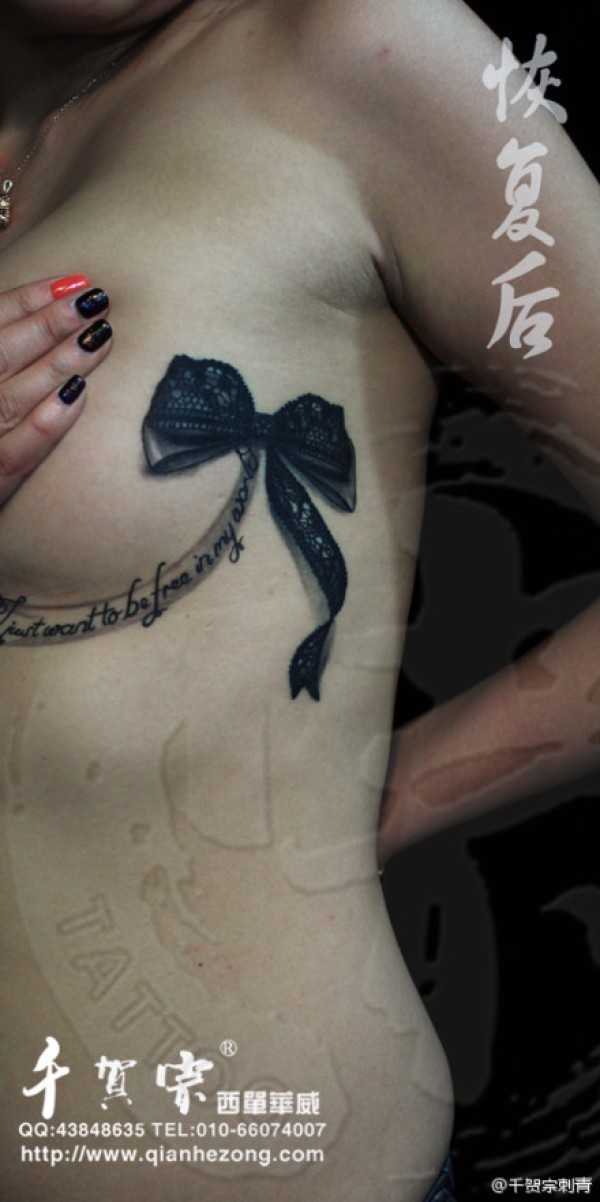 美女胸部潮流性感的蕾丝蝴蝶结纹身图案_蝴蝶纹身图案大全_纹身图吧