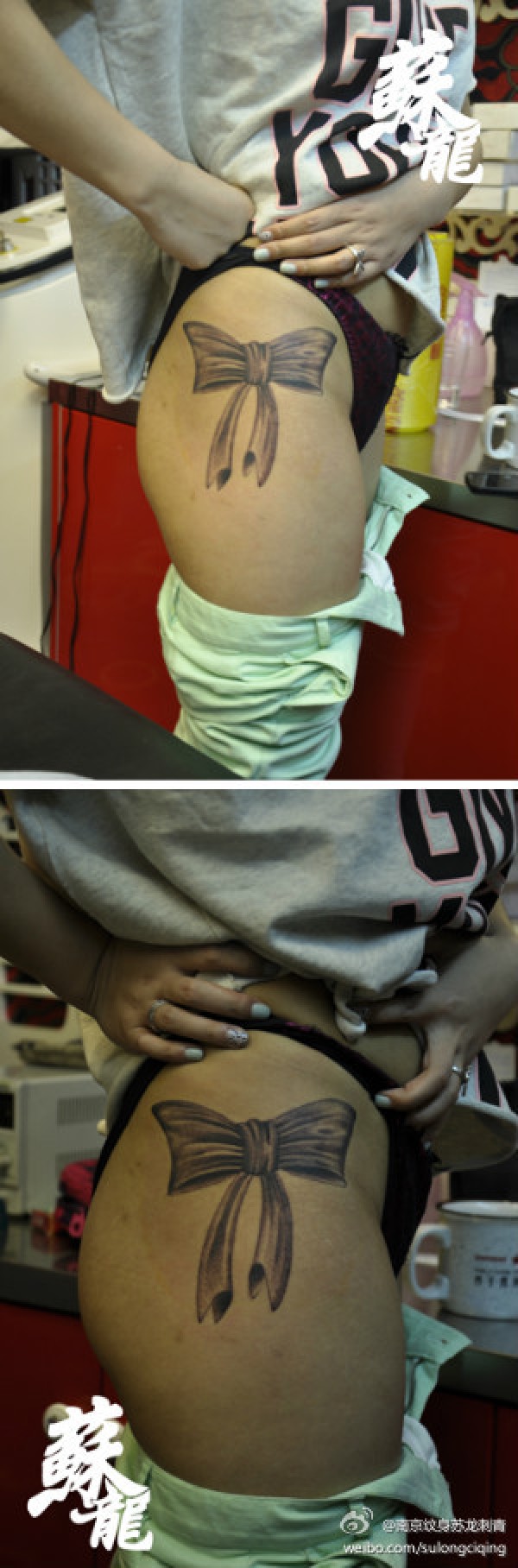 女人臀部唯美的黑灰蝴蝶结纹身图案_蝴蝶纹身图案大全_纹身图吧