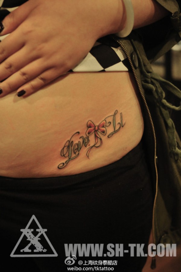 女生腹部潮流唯美的字母与蝴蝶结纹身图案_蝴蝶纹身图案大全_纹身图吧