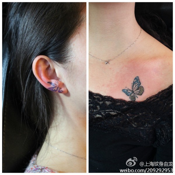 女生耳部与胸部唯美时尚的蝴蝶纹身图案_蝴蝶纹身图案大全_纹身图吧