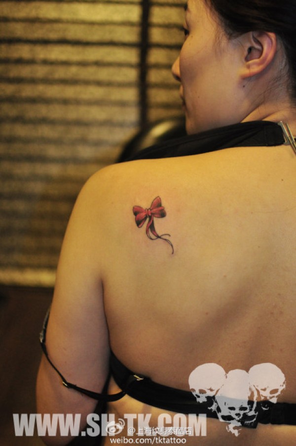 女生肩背流行小巧的蝴蝶结纹身图案_蝴蝶纹身图案大全_纹身图吧