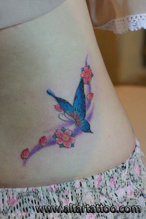美女腰部漂亮好看的彩色蝴蝶纹身图案_蝴蝶纹身图案大全_纹身图吧