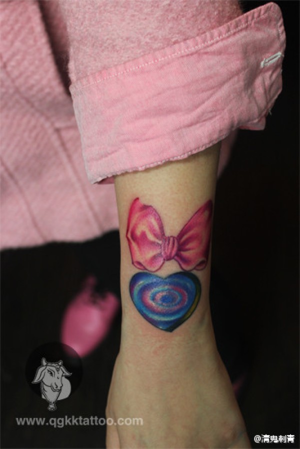 女生手臂好看漂亮的蝴蝶结与爱心纹身图案_蝴蝶纹身图案大全_纹身图吧