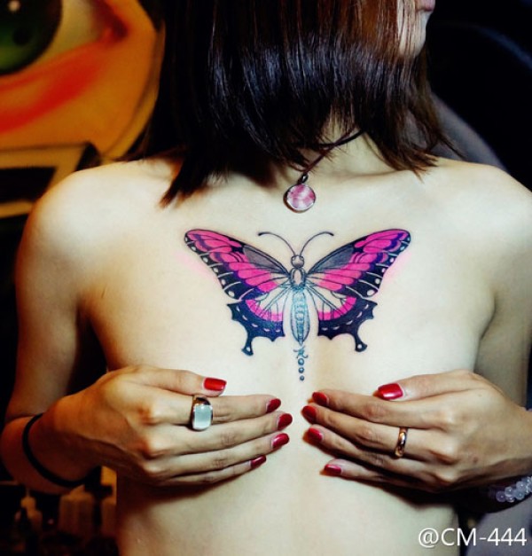 美女胸前好看的彩色蝴蝶纹身图案_蝴蝶纹身图案大全_纹身图吧