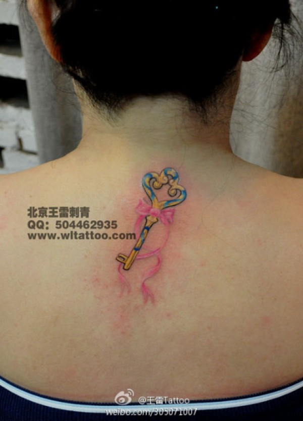 女生后背好看的钥匙与蝴蝶结纹身图案_蝴蝶纹身图案大全_纹身图吧