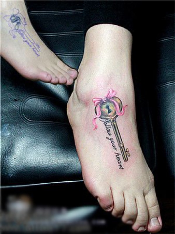 女孩子脚背漂亮的钥匙与蝴蝶结纹身图案_蝴蝶纹身图案大全_纹身图吧