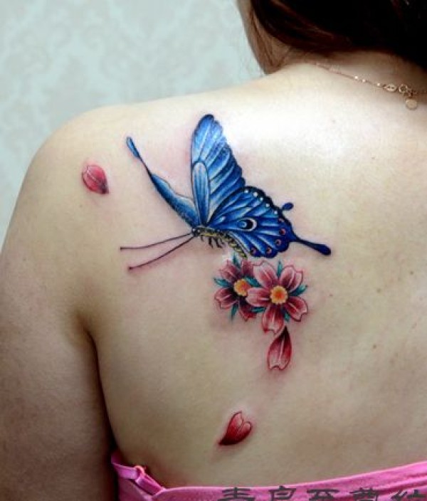 美女肩背漂亮的彩色蝴蝶与樱花纹身图案_蝴蝶纹身图案大全_纹身图吧