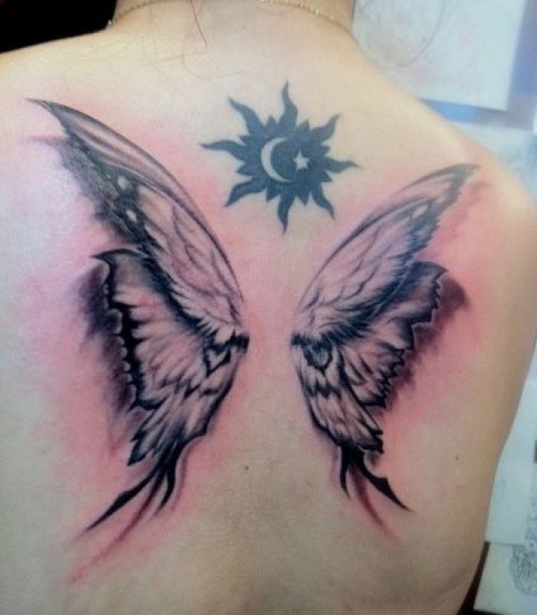 女生背部唯美的黑白蝴蝶翅膀纹身图案_蝴蝶纹身图案大全_纹身图吧