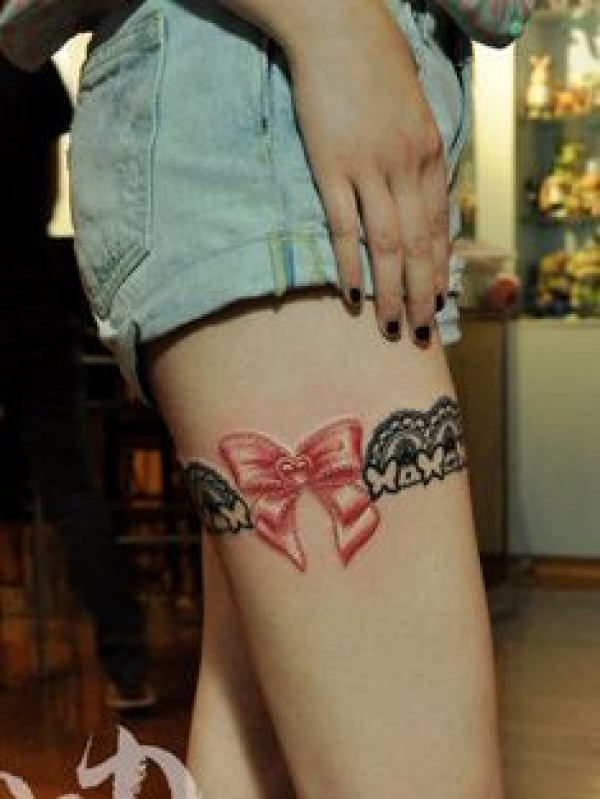 女生腿部时尚流行的蝴蝶结蕾丝纹身图案_蝴蝶纹身图案大全_纹身图吧