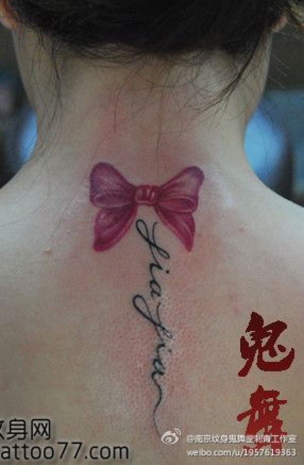 女生背部彩色蝴蝶结字母纹身图案_蝴蝶纹身图案大全_纹身图吧