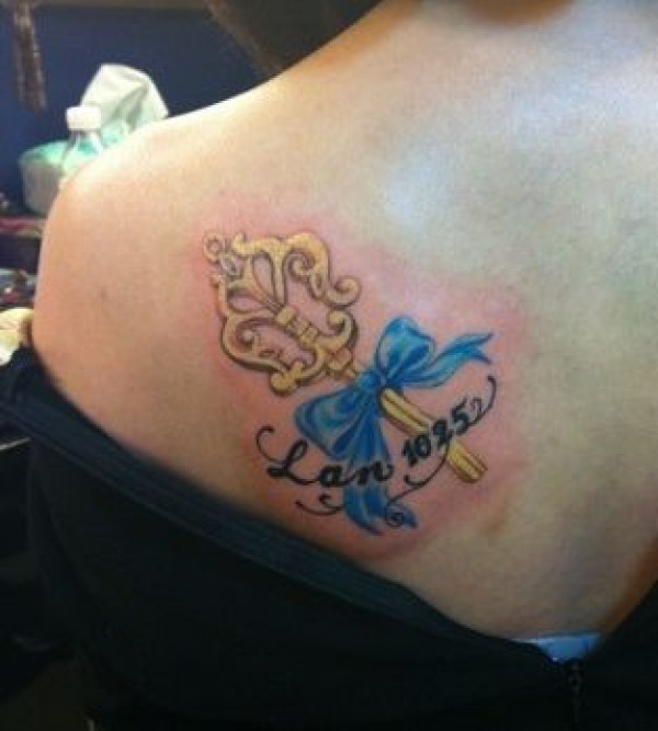 女生肩背精美的钥匙蝴蝶结纹身图案_蝴蝶纹身图案大全_纹身图吧