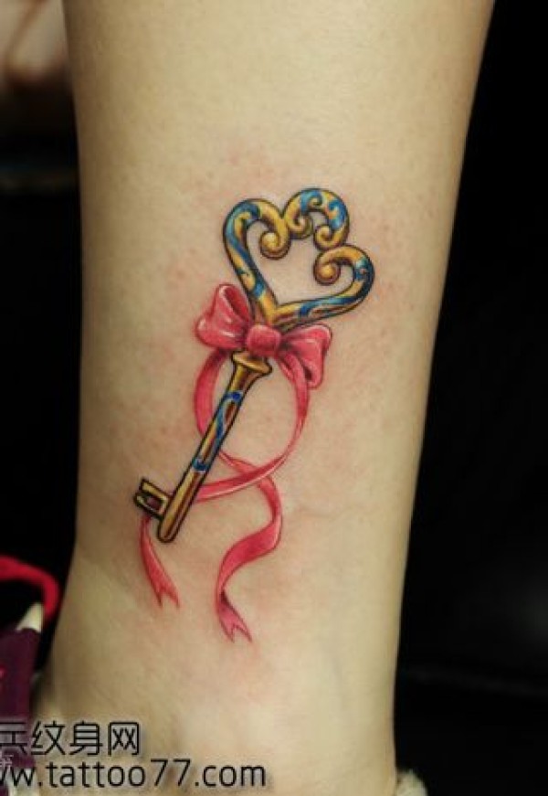 腿部彩色钥匙蝴蝶结纹身图案_蝴蝶纹身图案大全_纹身图吧