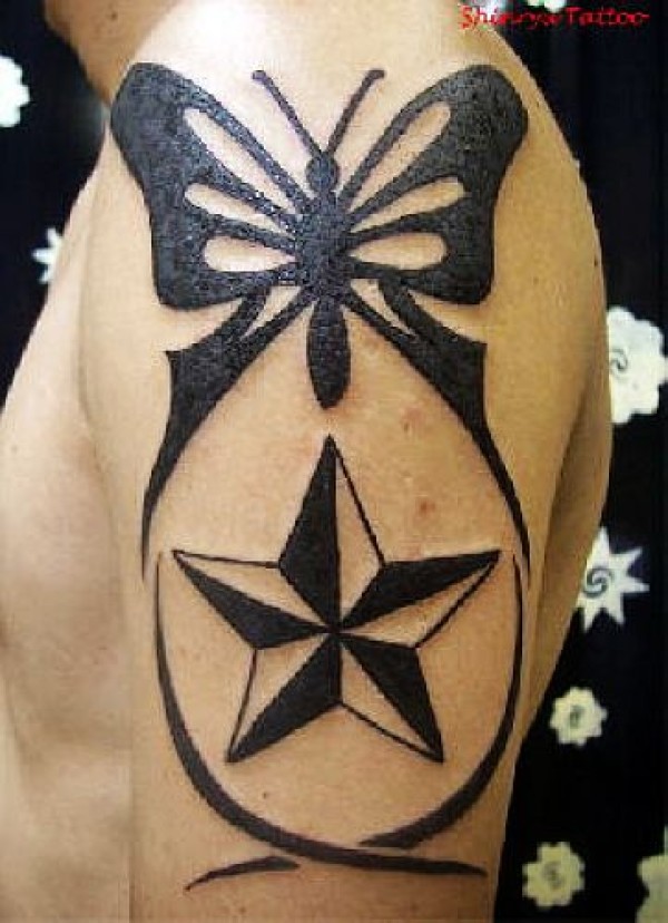 专业刺青店大臂图腾蝴蝶五角星纹身图案图片_蝴蝶纹身图案大全_纹身图吧