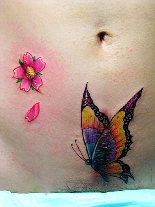 腹部文身图案腹部蝴蝶樱花文身图案图片_蝴蝶纹身图案大全_纹身图吧