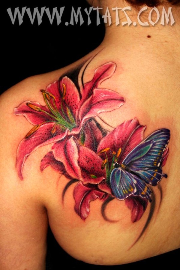 武汉纹身店后肩背百合蝴蝶纹身图案图片_蝴蝶纹身图案大全_纹身图吧