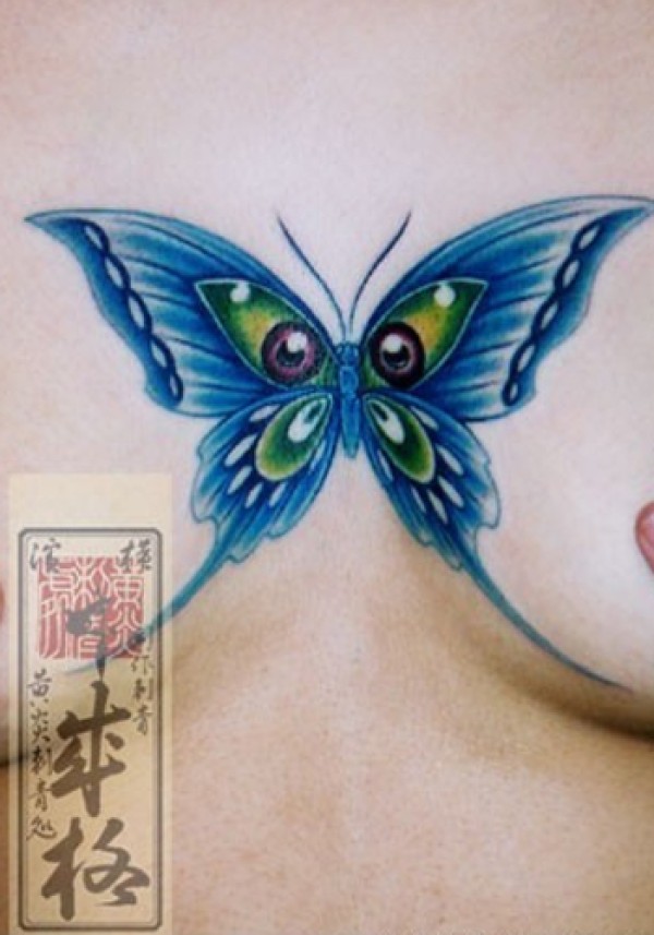 美女胸部彩色蝴蝶纹身_蝴蝶纹身图案大全_纹身图吧
