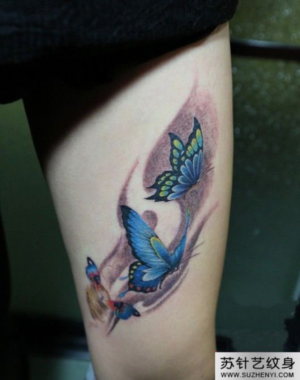 大腿飞舞蝴蝶刺青_蝴蝶纹身图案大全_纹身图吧