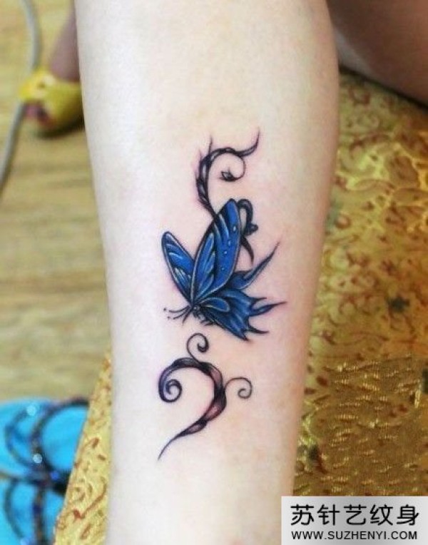 小腿蓝色蝴蝶纹身_蝴蝶纹身图案大全_纹身图吧