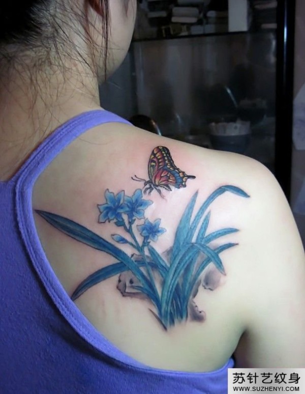 蝴蝶水仙花后肩纹身图案_蝴蝶纹身图案大全_纹身图吧