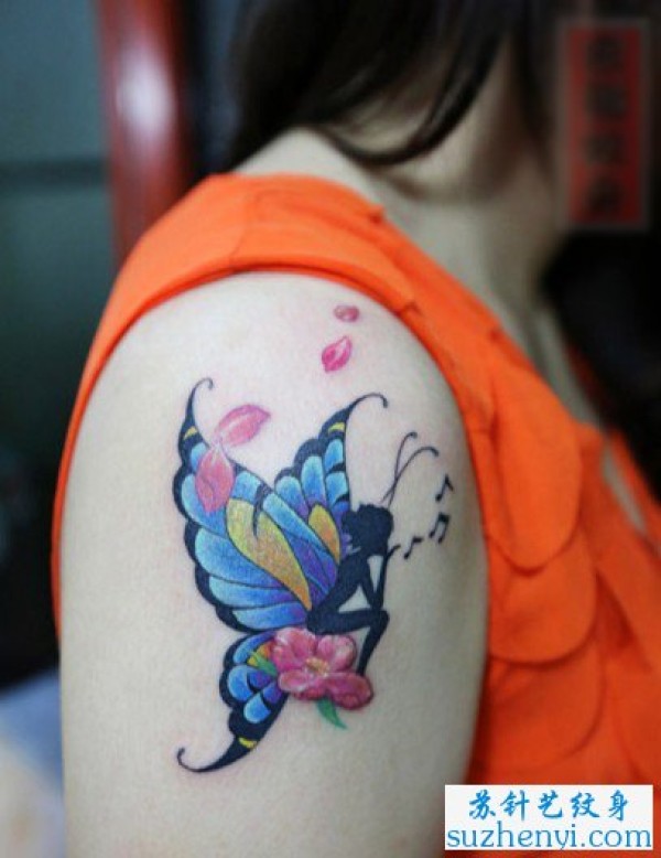 手臂彩色蝴蝶精灵纹身_蝴蝶纹身图案大全_纹身图吧