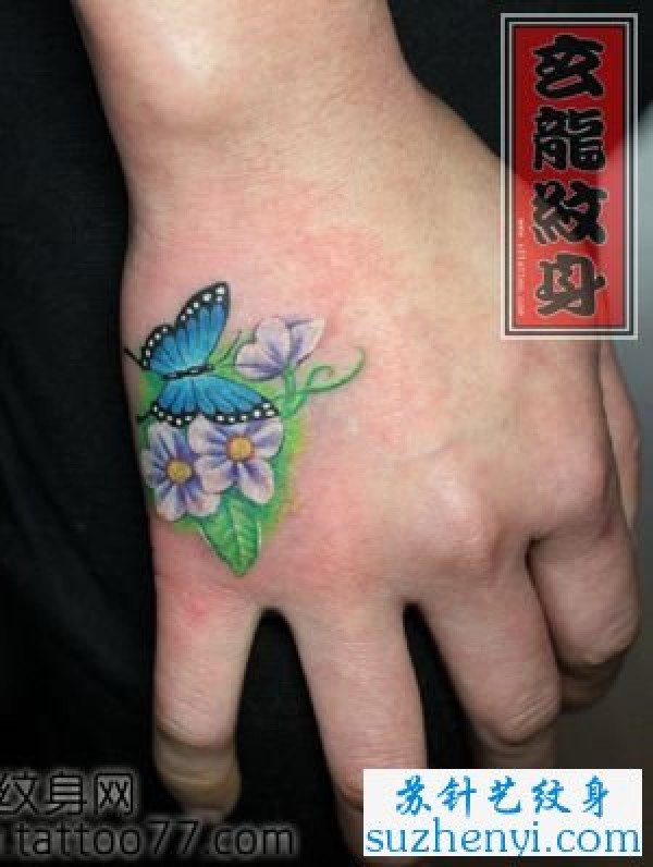 手背彩色蝴蝶花卉纹身_蝴蝶纹身图案大全_纹身图吧