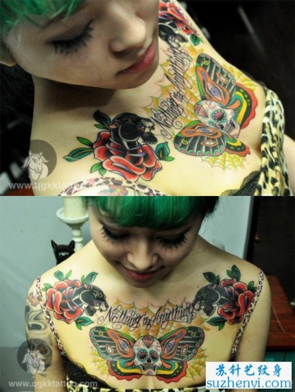 前胸骷髅蝴蝶纹身_蝴蝶纹身图案大全_纹身图吧