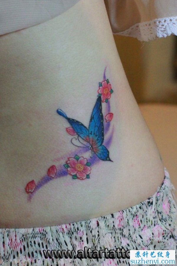 腰部蝴蝶樱花纹身_蝴蝶纹身图案大全_纹身图吧