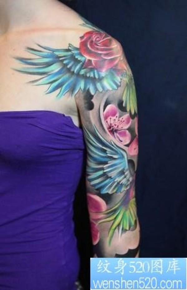 花臂玫瑰翅膀纹身图片作品_花臂纹身图案大全_纹身图吧