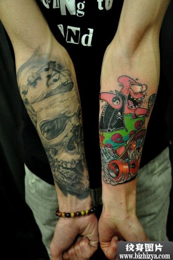 骷髅与派大星小花臂纹身图案图片_花臂纹身图案大全_纹身图吧