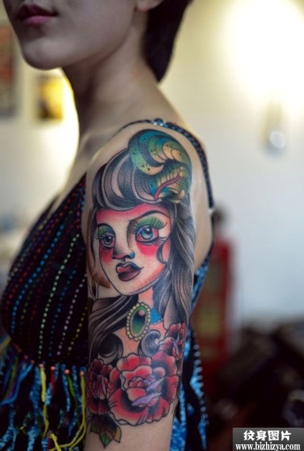 花臂姑娘头像玫瑰纹身图案图片_花臂纹身图案大全_纹身图吧