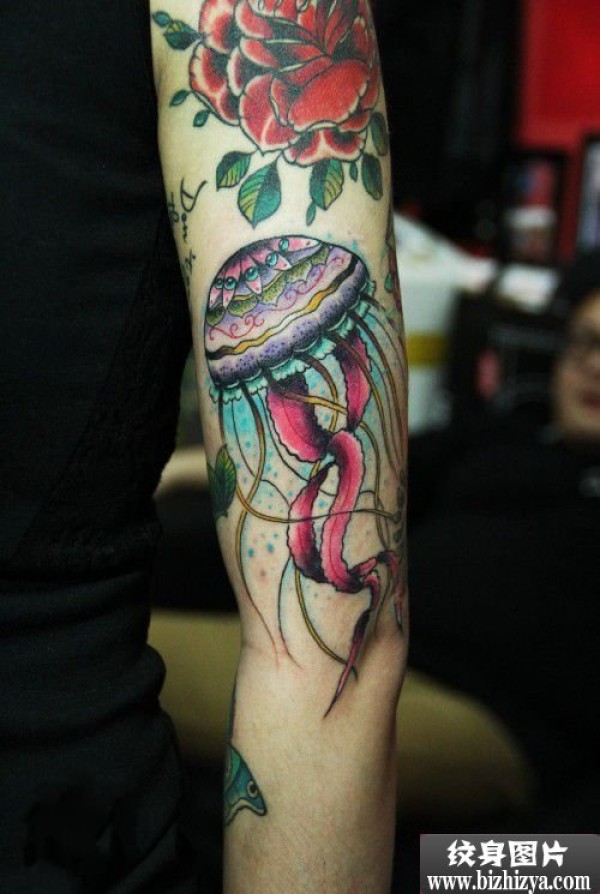 玫瑰花水母花臂纹身图案图片_花臂纹身图案大全_纹身图吧