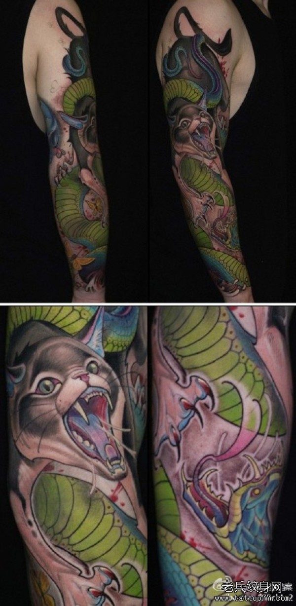 手臂时尚帅气的一款花臂蛇与猫纹身图案_花臂纹身图案大全_纹身图吧
