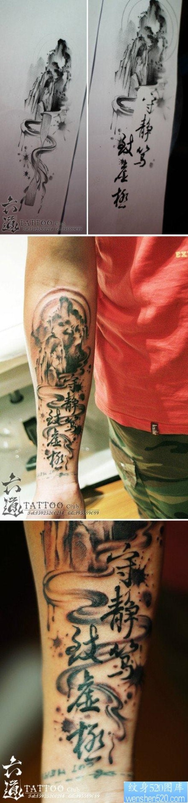 手臂潮流经典的山水画与汉字纹身图片_汉字纹身图案大全_纹身图吧