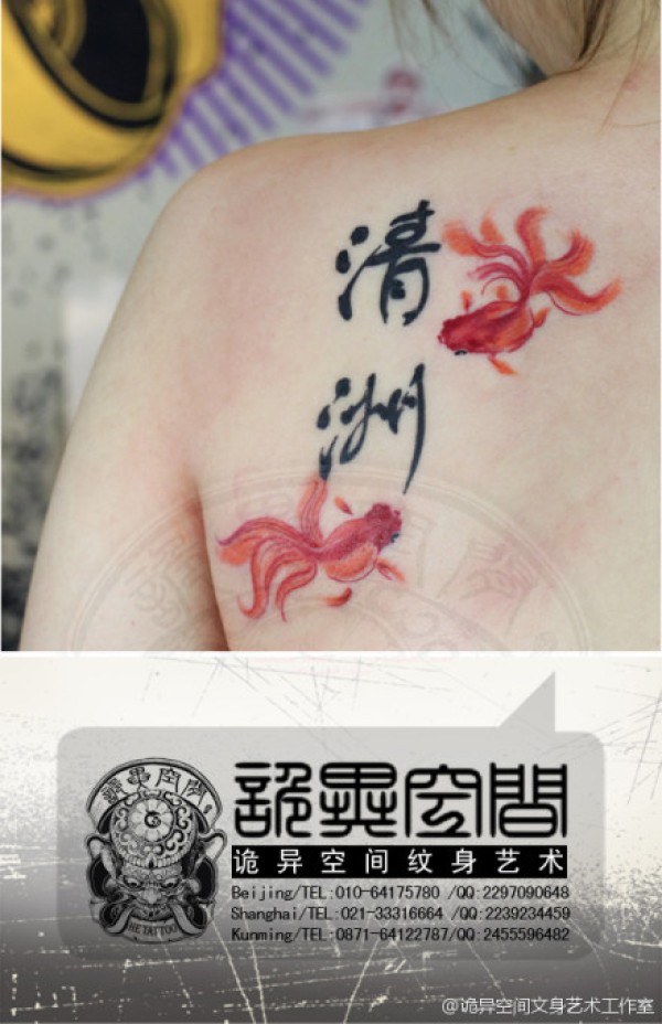后背潮流经典的书法汉字与小金鱼纹身图案_汉字纹身图案大全_纹身图吧