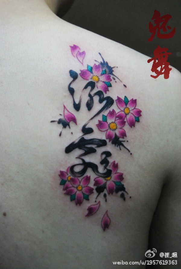 后肩背漂亮的书法汉字与樱花纹身图案_汉字纹身图案大全_纹身图吧