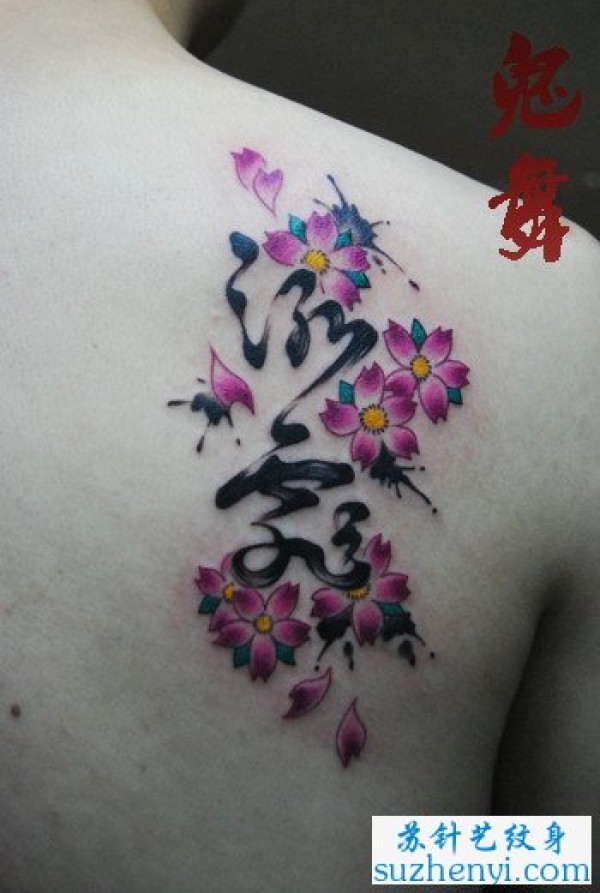 肩背水墨汉字与樱花纹身图案_汉字纹身图案大全_纹身图吧
