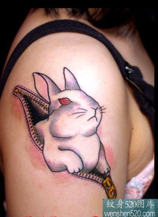 女子肩部的拉链红眼兔子纹身_肩部纹身图案大全_纹身图吧