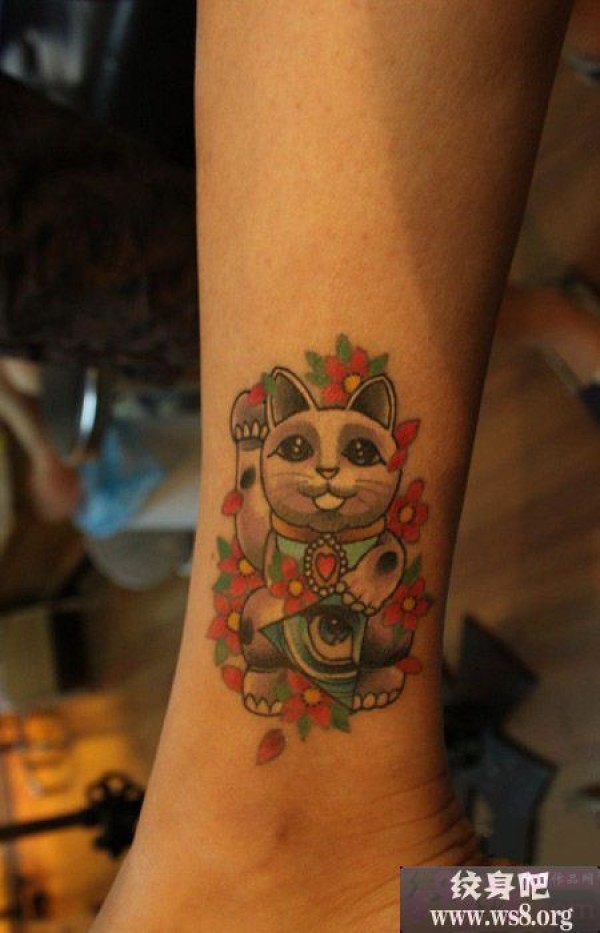 可爱小招财猫脚踝纹身图案_脚部纹身图案大全_纹身图吧