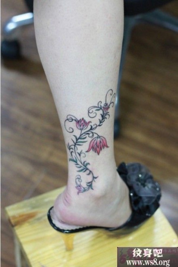 莲花藤蔓脚踝清新纹身图案_脚部纹身图案大全_纹身图吧