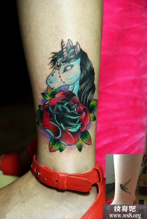 脚踝钻石独角兽花纹身图案_脚部纹身图案大全_纹身图吧